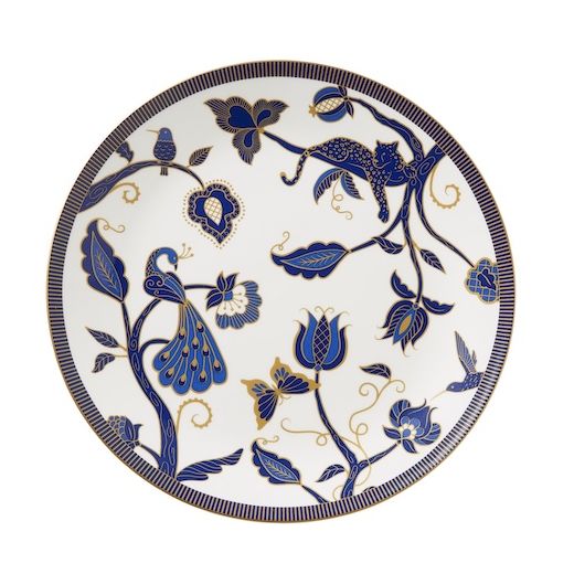 Immerse yourself in the vibrant allure of the William Edwards Makira collection, inspired by Madagascar's breathtaking biodiversity. With intricate illustrations of exotic animals and lush tropical foliage in rich blue tones, accented by shimmering gold mica, each piece exudes playful elegance. Perfect for transforming dining into an extraordinary experience.