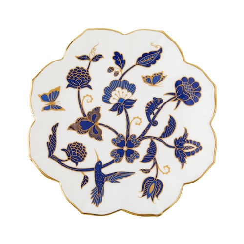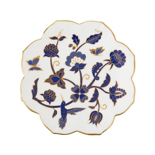 Immerse yourself in the vibrant allure of the William Edwards Makira collection, inspired by Madagascar's breathtaking biodiversity. With intricate illustrations of exotic animals and lush tropical foliage in rich blue tones, accented by shimmering gold mica, each piece exudes playful elegance. Perfect for transforming dining into an extraordinary experience.